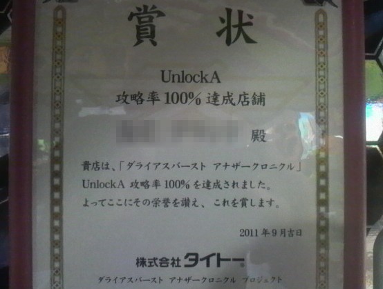 ダラバーの筐体横に貼ってあった賞状。