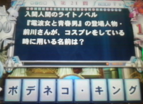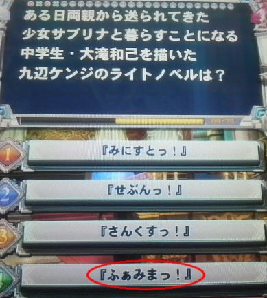 メインはクイズマジックアカデミー(QMA)、副業としてDJ(beatmaniaIIDX)、銀鷹を駆る漁師(ダライアスバーストAC)、ライトノベル批評家(笑)をやってる。コメントはWeb拍手からお願いいたします。